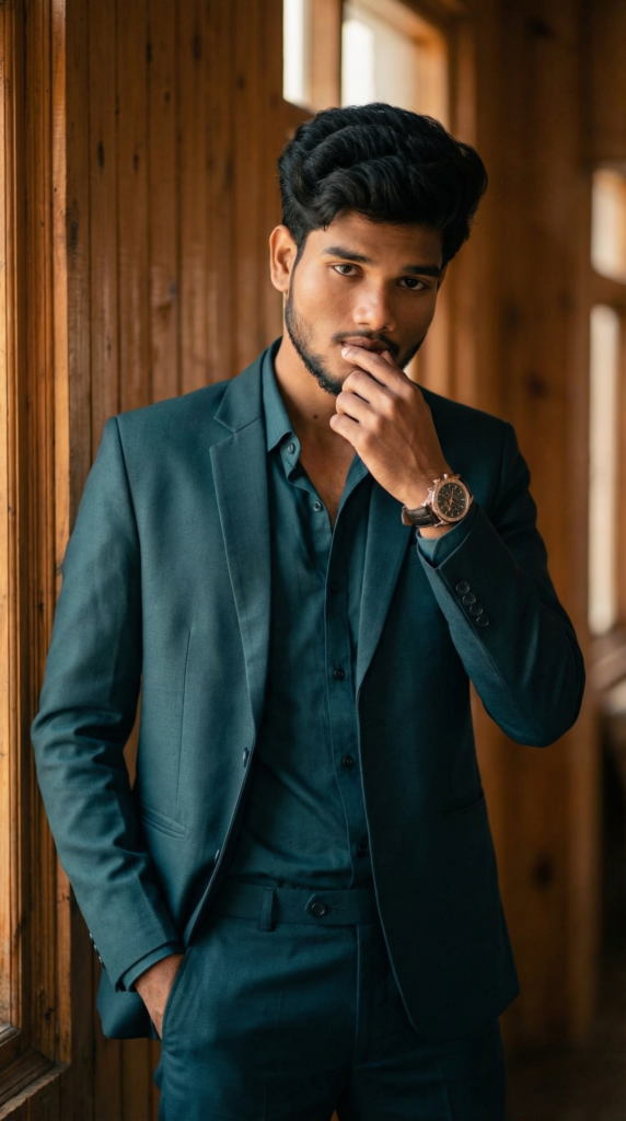 Ultra realistic portrait of a stylish person standing indoors near a wooden wall, wearing a dark teal suit with a matching shirt, open collar, one hand in pocket and other touching lips, confident and calm expression, sharp jawline, well-groomed beard, voluminous hairstyle, luxury wristwatch, warm cinematic lighting, soft shadows, shallow depth of field, 85mm lens, Sony A1 quality, ultra HD, natural skin tones, 100% face match