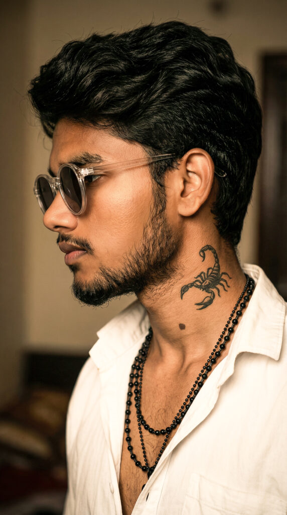 Ultra realistic close-up side profile portrait of a person with natural beard growth matching their actual face (no extra density, realistic patchiness as per real beard), thick wavy hair, wearing round transparent sunglasses and a slightly open white shirt, layered black bead chains, visible scorpion tattoo on neck, sharp facial features, cinematic warm lighting, high contrast shadows, ultra detailed skin texture, shallow depth of field, soft blurred indoor background, 85mm lens, Sony A1 quality, ultra HD, natural tones, 100% face match